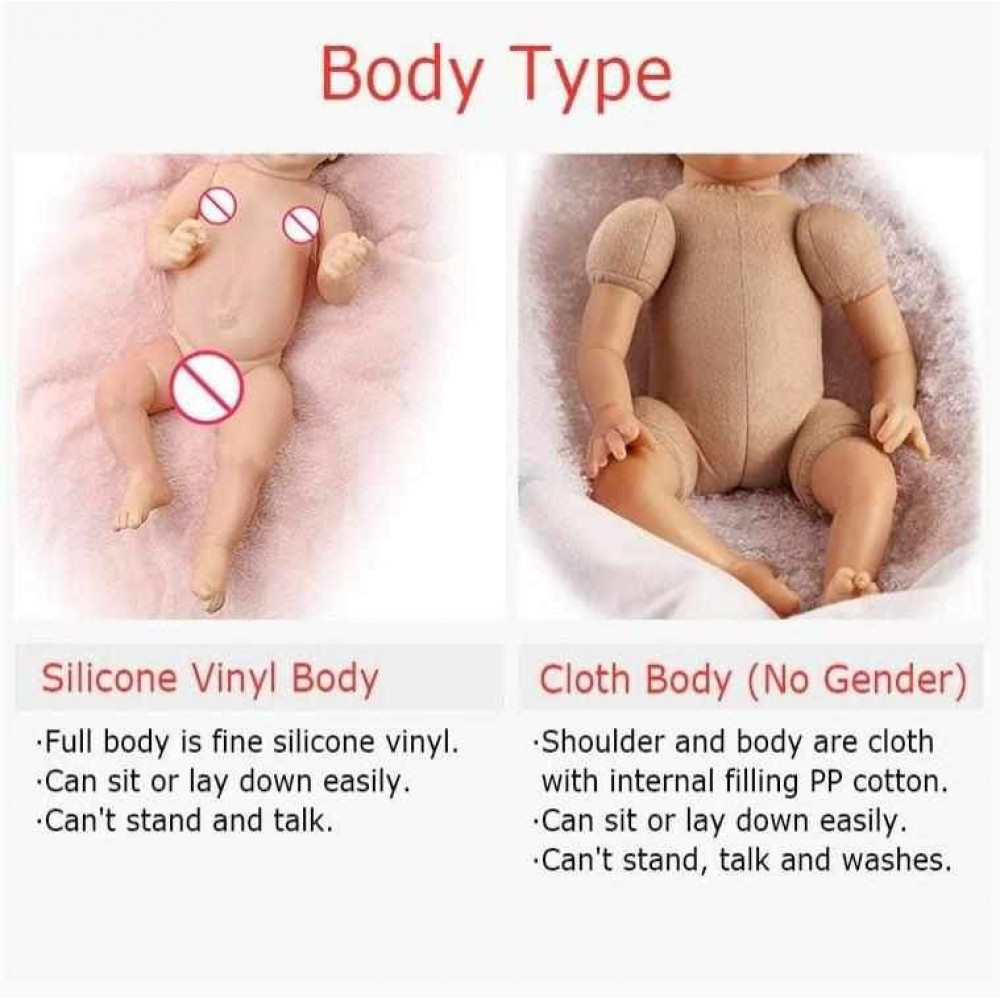 ❤ DETAIL - Silicone vinyl full body; In order to make the baby doll's limbs move more freely, the silicone vinyl body will a bit hard.